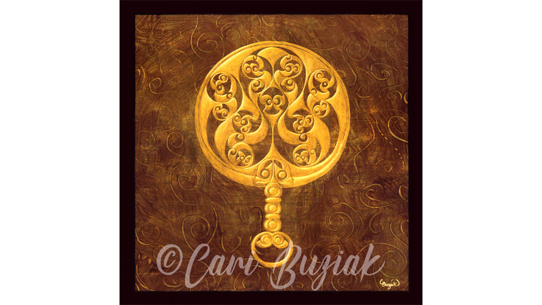 This was an idea that I had been wanting to work on for a while. The artwork design is based on the Holcombe Mirror, from the late La Tene era. The mirror image sits on a background of hazy spirals and swirls in dark umber and metallic gold shimmer. It's a very different style than what I've worked in so far, and I'm extremely happy with the way it turned out. This painting was framed in a gold wood frame, without glass, giving it a lovely gold edging around the spiral background.