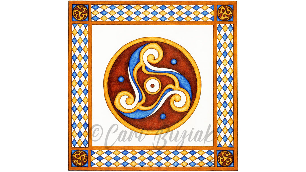 This painting is part of a pair, with its match being Wands Shield. The paintings are traditional La Tene style designs framed in a harlequin style border pattern, with little triskels in the corners.