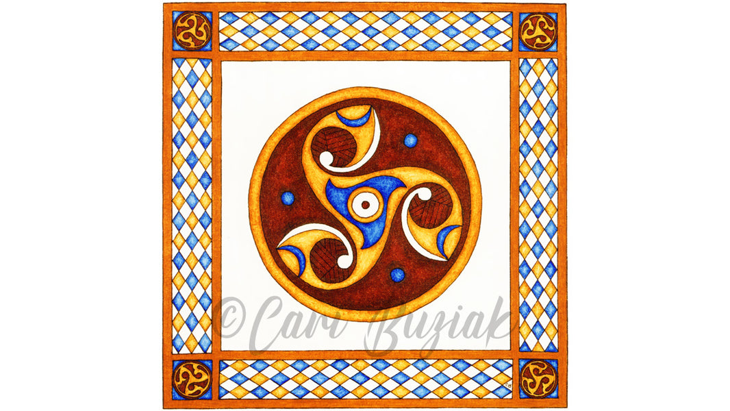 This painting is part of a pair, with its match being Triskel Shield. The paintings are traditional La Tene style designs framed in a harlequin style border pattern, with little triskels in the corners.