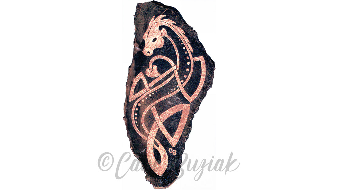 Many people have written in to comment how ancient and historical my dragon here looks, which is so flattering! I love the ancient works and I really try to give homage to the feel of them in my own work. However, do note that my dragon is a new and original work, not from anything historical. He's well travelled, but is an original work and as such protected by international copyright laws.