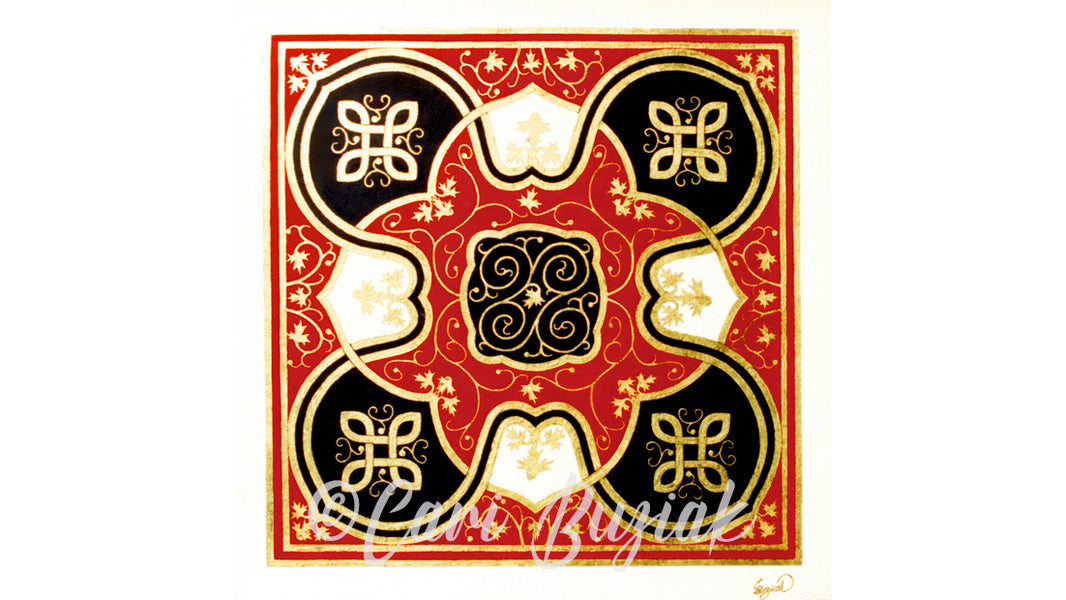 I often like to look at books of old manuscript "carpet pages" for ideas in color and design for my paintings. Here the pattern shows a Celtic influence with colors from an Arabic manuscript page. I combined all that with some leaf work patterns to give texture to the broad red fields. I really loved how this one turned out, it was really striking once it was framed and it's one of my favorite pieces.