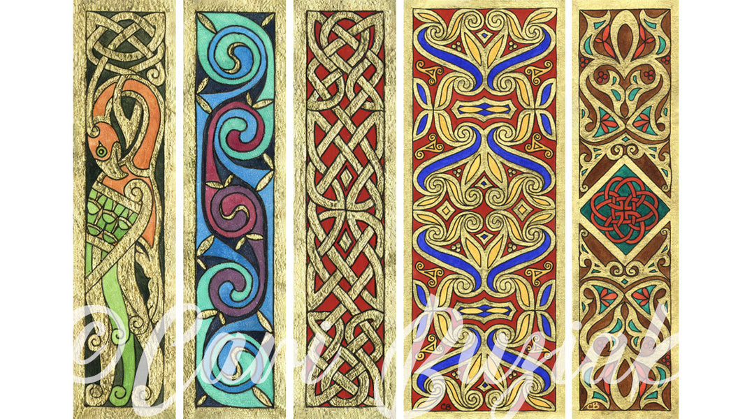 This painting features a traditional looking "S" spiral border design, as can be seen in manuscripts like the Lindisfarne Gospels or the Book of Kells. This design however is colored in a more fantasy style palette, for a twist, and is my own modern spiral pattern.
