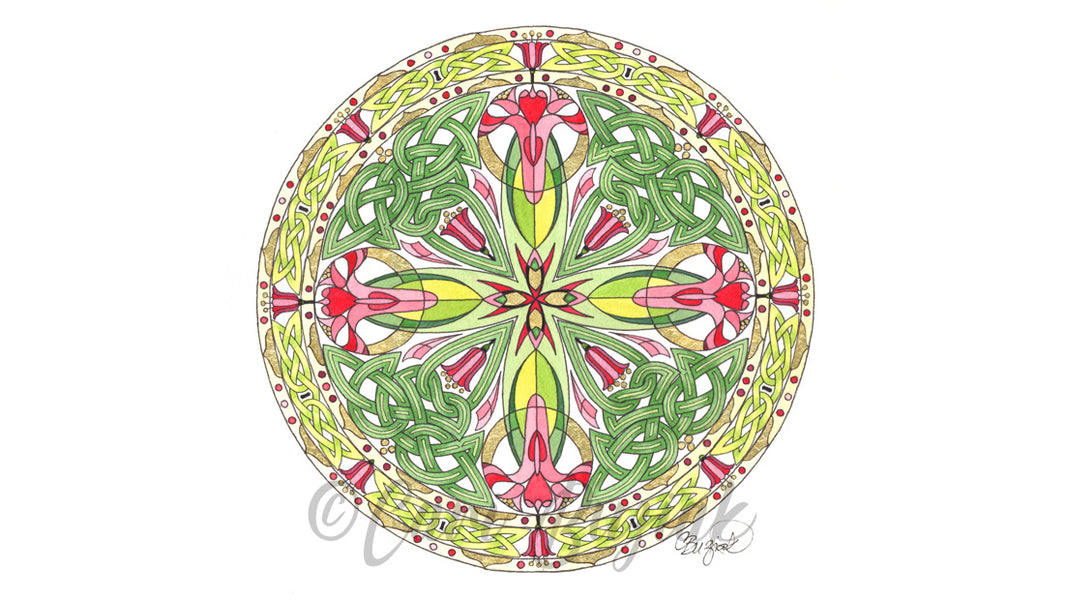 A beautiful delicate piece feature art nouveau styled lilies nestled in a forest of green Celtic knots. Each lily features dutch gold leaf accents, and the piece comes matted in a matching white matte (but not framed). This is a finished painting based on artwork from my Celtic Mandalas coloring book published by Dover Publications.