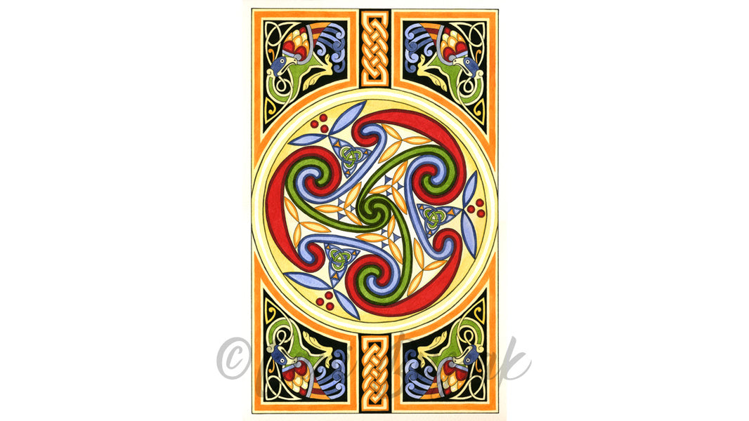 The original cover artwork that I painted for my book Calligraphy Magic: How to Create Lettering, Knotwork, Coloring & More. The biggest challenge with a piece like this is trying to anticipate how it's going to both look as a cover, as well as how the cover will be laid out. I actually proposed the cover design because of this, to try and take advantage of the design and really give impact to the Celtic elements of the artwork. Although traditional Celtic coloring is much more bright and primary, I wanted to use a more muted or "foresty" shade of colors instead, to give it a warm and earthy feel. The painting includes a matte and is ready for framing!