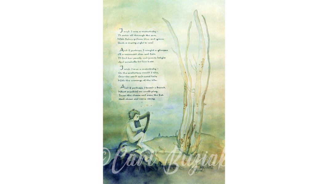 Years later, I was inspired to write a poem about it (the poem isn't from his book, just a silly little rhyme of mine). Of course, with the poem had to come a painting, and here it is... my wee little waterbaby playing his harp for the fishes of the sea!