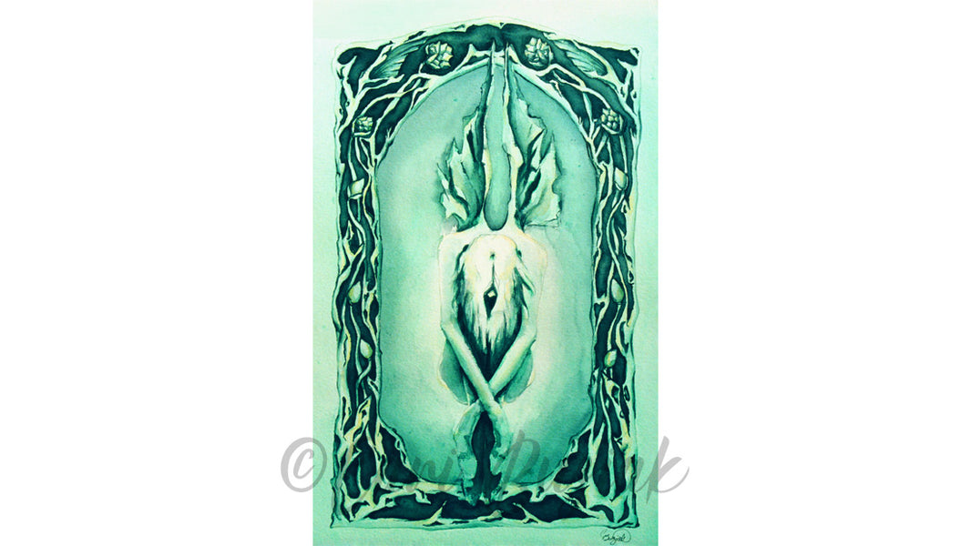 This is the 'crysalis', the beginning of creation and the transformation into a higher creature or being. Here we have a faery spirit all huddled into herself, awaiting a rebirth or just emerging from it, much like a caterpillar would into a butterfly. Around her is a border of plants, beginning as roots, then as dormant plant shoots, and then to buds and blooms of flowers as you follow them up the border.