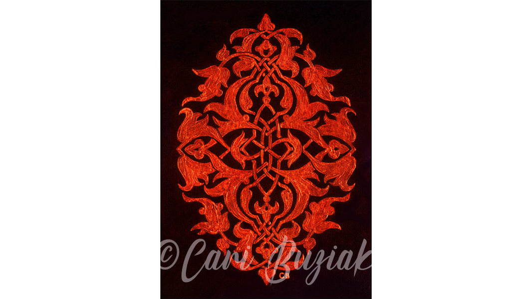 I was inspired to do this painting after visiting a hand woven rug shop. They told me the design was Islamic, and after I made some rough sketches in the shop I came home and made my Celtic version shown here. Although it had its start as an Islamic rug, the finished knot reminds me of a Celtic bonfire in the black of night - perfect for Beltaine!