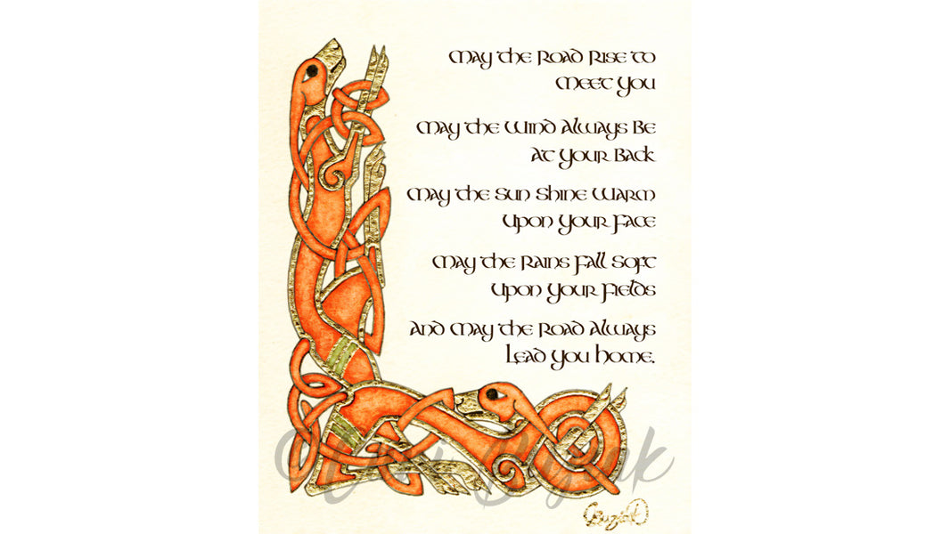 A little painting I did some years ago, featuring a pair of russet Celtic hounds leaping along beside this traditional Irish blessing. I have updated the calligraphy so it's more readable at a small size, and now it's available on greeting cards!