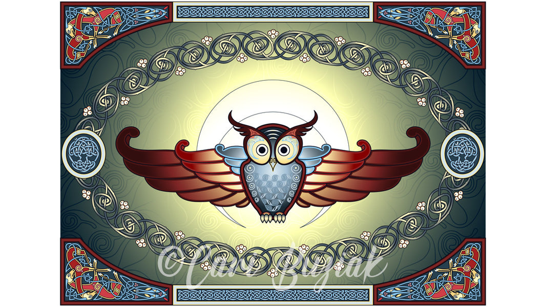 A glorious owl created in full Celtic style! This painting features all the basic elements of Celtic design - knotwork, spirals, and zoomorphics, symbolizing the unity between people, the abstract, and nature. The owl, bracketed by two Celtic Tree of Life designs, rises above a sickle moon. Hounds, here representing loyalty and constance, guard the shapeshifter during his flight.